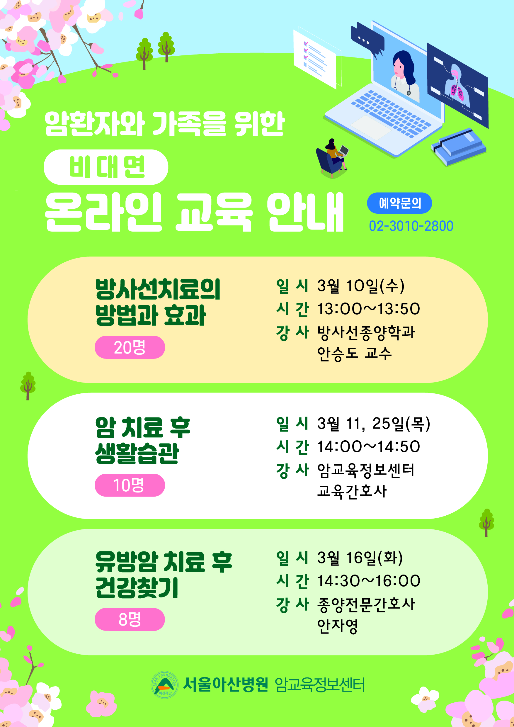 1) 방사선치료의 방법과 효과 3월 10일(수) 13:00~13:50 2) 암 치료 후 생활습관 3월 11, 25일(목) 14:00~14:50 3) 유방암 치료 후 건강찾기 3월 16일(화) 14:40~16:00