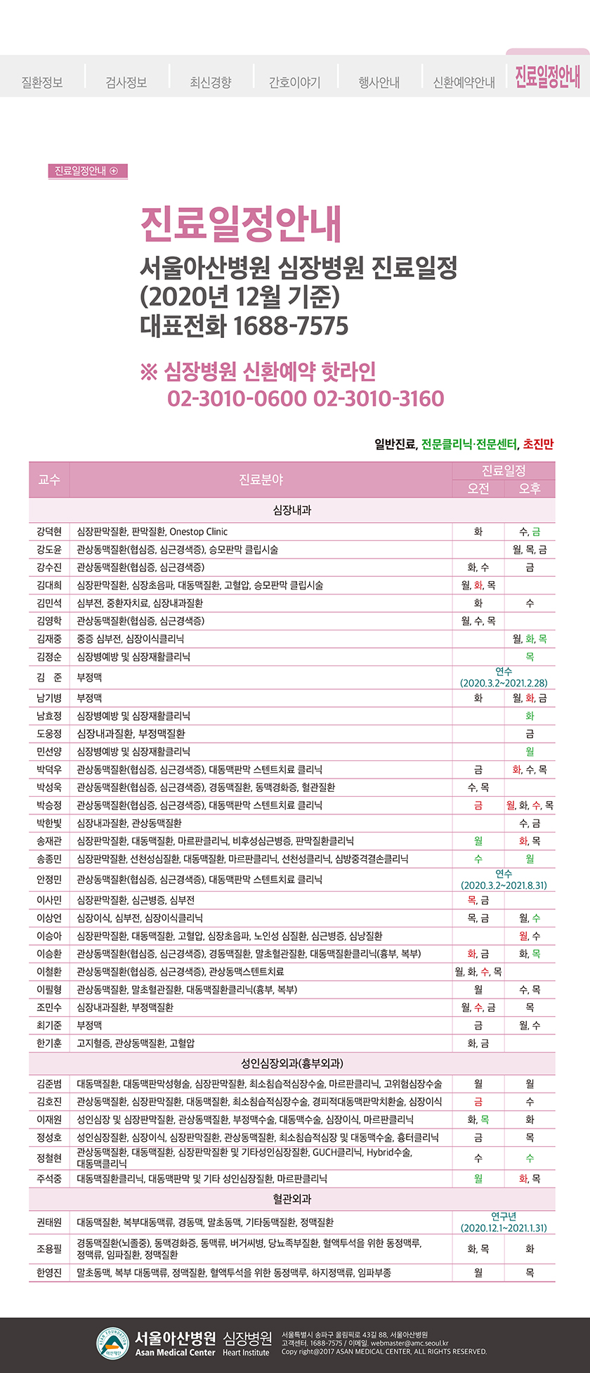 [아산심장소식지2020년 겨울호] 진료일정안내