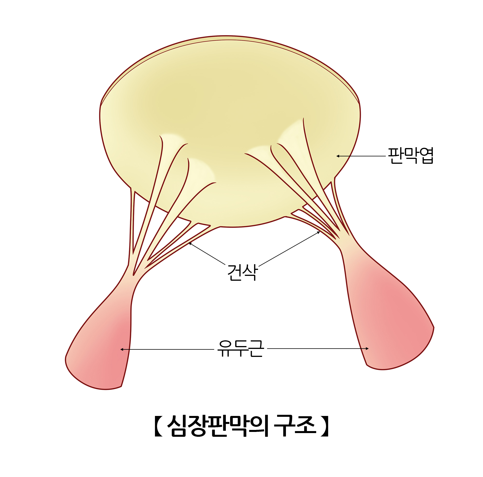 삼첨판과 폐동맥판, 대동맥판은 3개의 첨판으로 이루어져 있는 반면 승모판은 2개의 첨판으로 이루어져 있습니다. 그리고 삼첨판과 승모판에는 판막아래 구조를 지지하는 낙하산 모양의 인대와 유두근이 있으나 대동맥판과 폐동맥판에는 이런 구조가 없습니다.