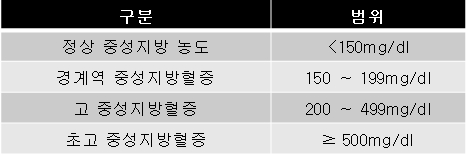 중성지방이 1000mg/dL 이상으로 매우 높을 때에는 췌장염으로 진행될 위험이 증가하므로 빠른 치료가 필요합니다.
